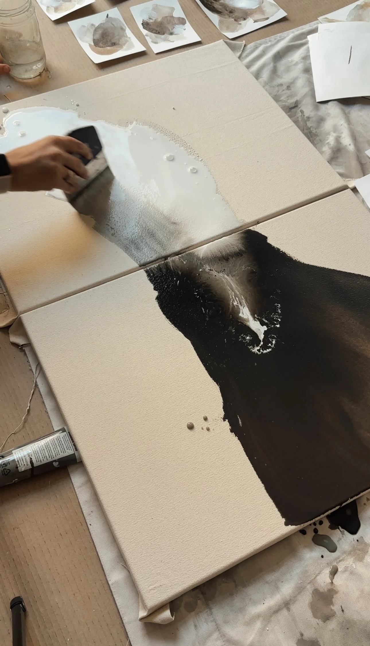 Her process unfolds intuitively: each brushstroke leads to the next, each layer an embrace of the unexpected. Working primarily with liquid acrylics, inks, and water on canvas, she creates delicate washes and organic forms that echo the shifting rhythms of the natural world.